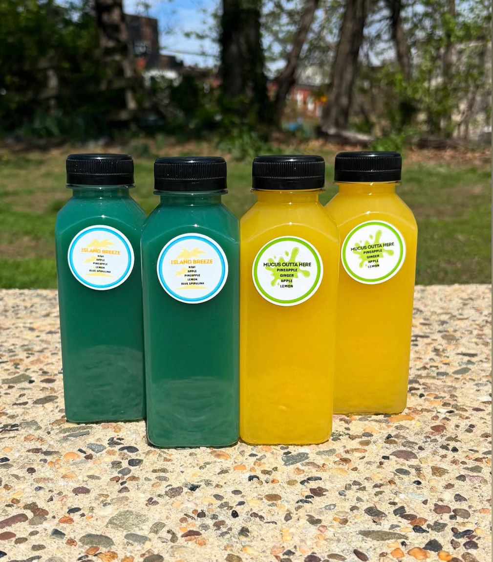 Our smoothies have a coconut water and raw agave base which makes them light and sweet. They come in two sizes (12 oz and 16 oz) and you can add extras like sea moss, hemp seeds, chia seeds, and much more. Our juices come in six different sizes, from 12 oz to 64 oz. Please see the menu below for all the yummy details.